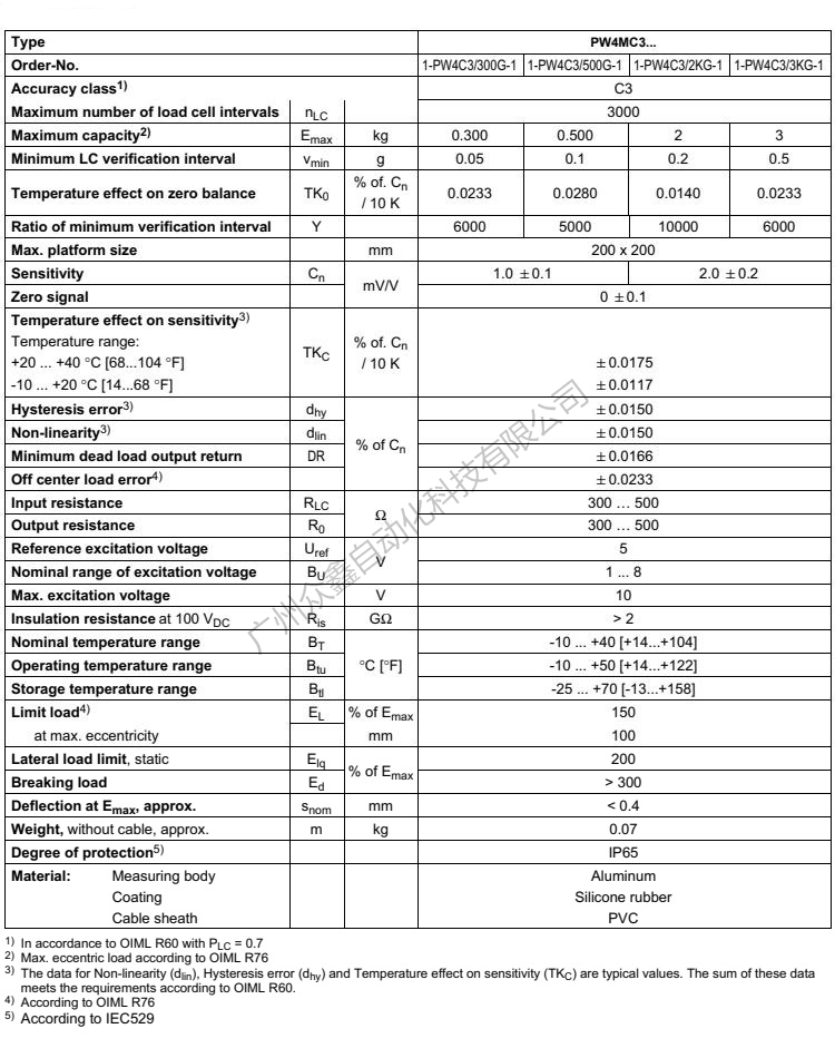 五、PW4MC3称重传感器技术参数