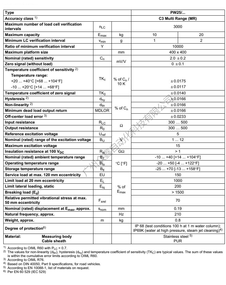 五、PW25C3称重传感器技术参数