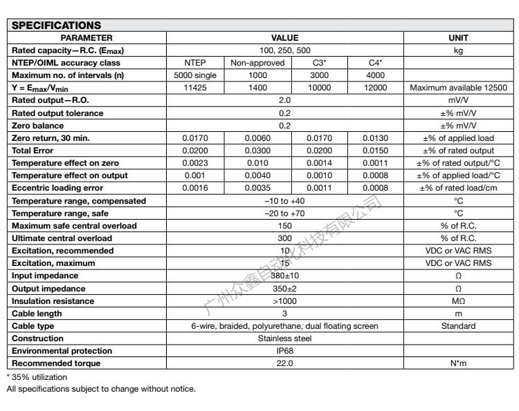 五、美国特迪亚 1510-500kg称重传感器技术参数