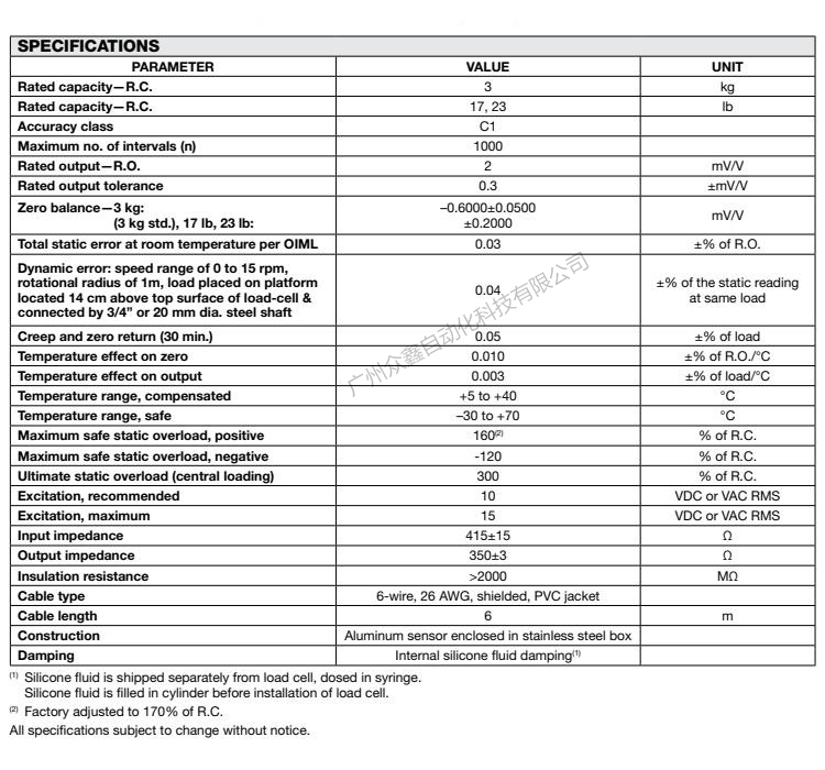 五、美国特迪亚 1430-23lbs称重传感器技术参数