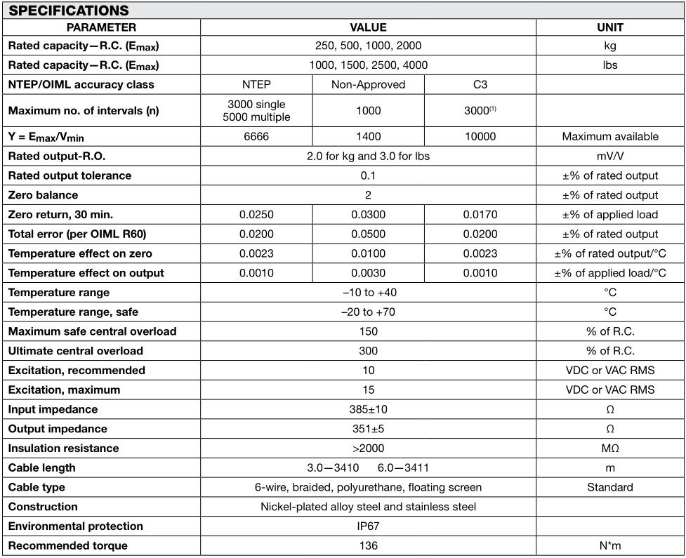 Tedea-Huntleigh特迪亚3410系列技术指标
