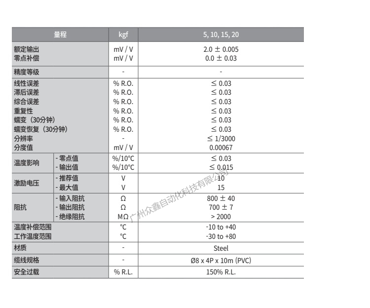 五、韩国凯士CAS品牌 DES-B-20T称重传感器技术参数