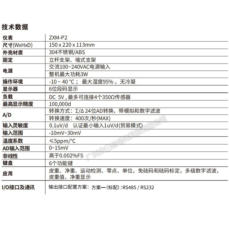 ZXM-P2采用Delta-sigma模数转换及数字滤波处理技术。主要用于贸易结算、物流称重、动物称重、计数等场合,通过RS232/485串口通信,很容易与触摸屏或PLC组成称重系统。