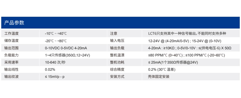 可选输出:电压0-5V/0-10V; 电流4-20mA;可同时驱动4个350Ω传感器